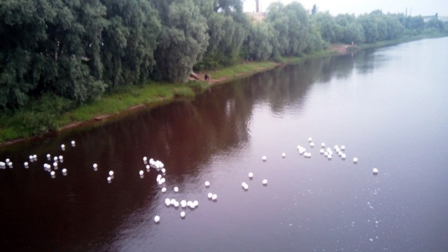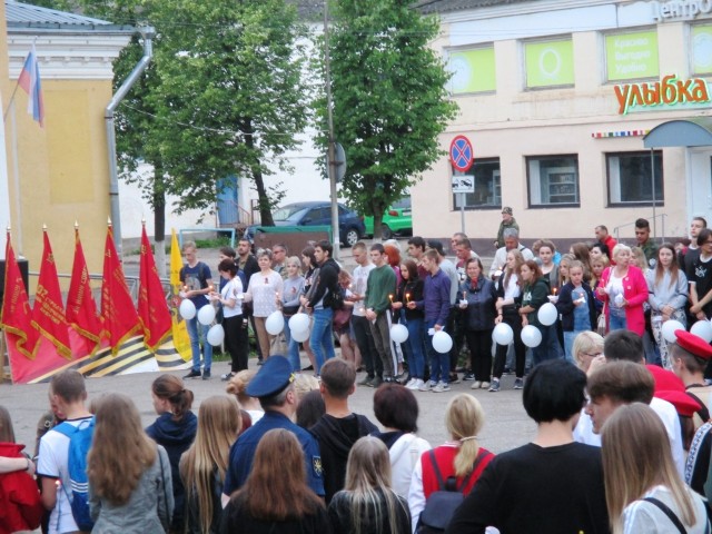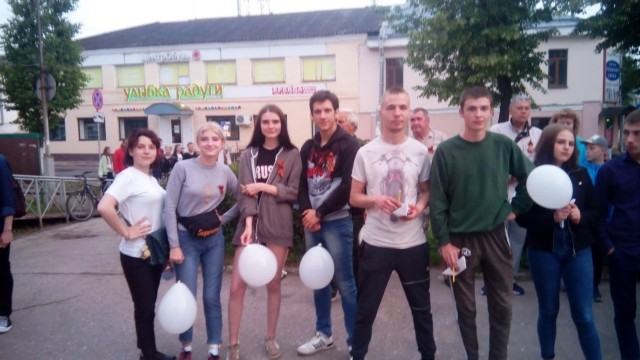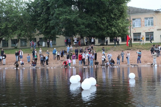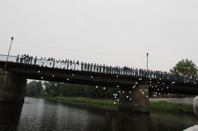 Построившись в колонну, участники акции проследовали к реке. Ветераны с катера спустили на воду траурный венок. В это же время с Живого моста участники акции,в том числе и наши ребята, отпустили белые воздушные шары, а с правого берега Полисти бумажные кораблики с зажжёнными свечами.