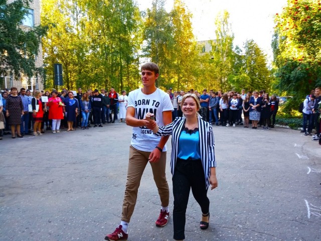 Оповестить о начале учебного года и дать первый звонок вышли лучшие студенты колледжа: Николаева Александра и Беспалов Никита.